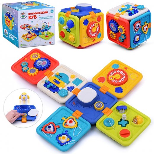 Изделие представляет собой куб с шестью многофункциональными гранями, с яркими, разноцветными элементами различных размеров и форм. Форма изделия позволяет увлечь одновременно нескольких детей. Кубик предназначен для развития тактильных ощущений, мелкой моторики, воображения и зрительной стимуляции. Шесть съемных сторон куба соединяются в одну игровую панель: крутящиеся шестеренки; космо станция; часики; забавные зверьки; космодром и ракеты.
