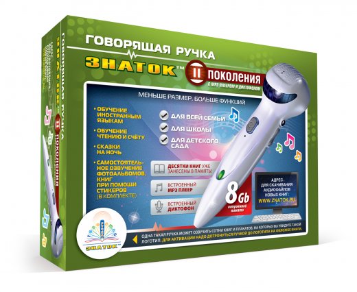 "Говорящая ручка Знаток II поколения 8Gb" – это интерактивная обучающая ручка для занятий иностранными языками, обучения счету и чтению, прослушивания сказок и создания собственных проектов. Причём, ручка озвучивает не только слова, но и рисунки! Для превращения ручки в удивительного рассказчика и доброго учителя достаточно коснуться, расположенного на книге или плакате, вот такого логотипа ►