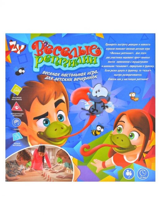 Возраст, лет 3+ Высота упаковки, см 26,5 Длина упаковки, см 26,5 Комплектация маски-2 шт, язык- 2 шт, мишень- 10 шт, карты-10 шт, мундштук- 2 шт Материал картон, пластмассаКупить настольную игру Веселые рептилии в Новосибирске Вы можете в магазине настольных и развивающих игр "Игры Почемучек"
