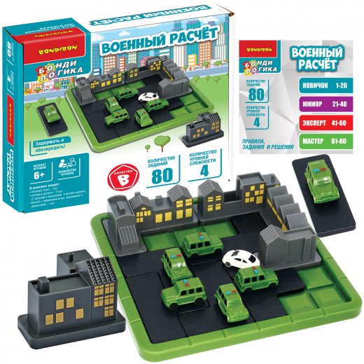 Задержать и обезвредить!В настольной игре "ВОЕННЫЙ РАСЧЁТ" от Bondibon Вы можете помочь военным, которые хотят поймать злодея в белом автомобиле. Используйте свой ум, чтобы поймать его в ловушку.Помимо интеллекта логическая игра позволяет развивать внимание, пространственное мышление, зрительно-моторную координацию.Выберите задание. Поместите белую машину и здания указанным в задании образом. А теперь расположите все детали с военными машинами так, чтобы белый автомобиль не имел никакого пути для выезда и бегства. У каждого задания есть только одно верное решение.80 захватывающих миссий, 4 уровня сложности!