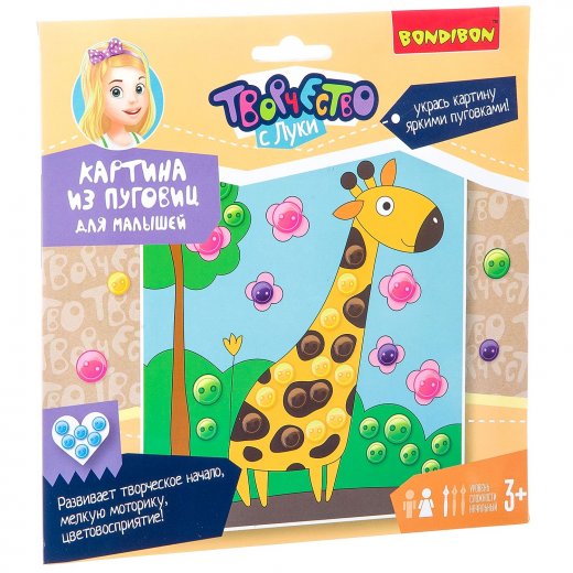 Займитесь увлекательным творчеством вместе с ребёнком и создайте милую картинку из пуговиц! Эти обыкновенные предметы станут интересным декором, которым ребёнок будет украшать персонажа. Красочные самоклеящиеся пуговки разных размеров легко крепятся к основе, создавая объемный сюжет. Готовую картинку можно поместить в рамку и украсить ею интерьер, а также подарить ее в качестве сувенира, сделанного своими руками.