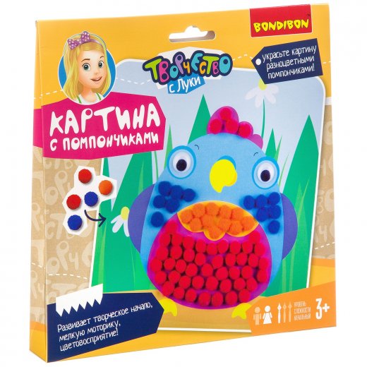 Состав набора: цветная основа для картины, набор помпончиков, клей.