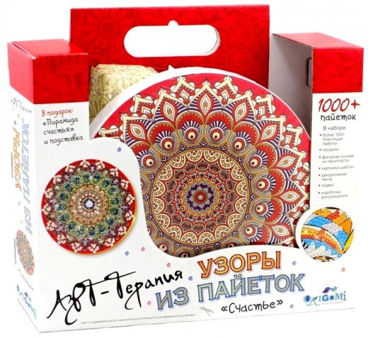 Мозаика из пайеток Счастье – это набор по созданию оригинального панно при помощи искрящихся цветных пайеток от российского производителя "Origami", он несомненно понравится маленьким рукодельницам, ведь они смогут самостоятельно создать красивую картину с изображением декоративного узора, замечательный подарок маме, бабушке или подруге.