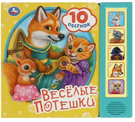 Озвученная книга c русскими народными потешками и красочными иллюстрациями. 5 звуковых кнопок, 10 фрагментов песенок: «Идёт коза рогатая», «Петушок», «Пошёл котик на торжок», «Кисенька! Где была?», «Сорока», «Курочка-рябушечка», «Лиса по лесу ходила», «Сидит белка на тележке», «Пожар», «Мишка косолапый». Говорящая книга для малышей с годовалого возраста помогает развить мелкую моторику и способствует запуску речи. Поющая книжка-игрушка с кнопочками - идеальный подарок для мальчика или девочки.