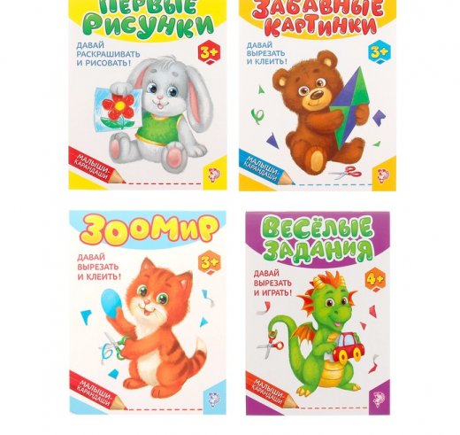 В наборе представлены книги, которые научат кроху не только делать аппликации, но и рисовать и даже изготавливать игрушки из бумаги: