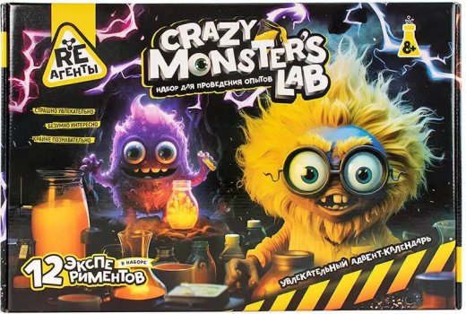 Большой подарочный набор опытов Crazy Monstr's Lab- это увлекательный адвент-календарь с 12 опытами внутри. Каждый опыт представляется своим забавным монстром, а подробная инструкция представлена в стихотворной форме в стилистике "Вредных советов".
