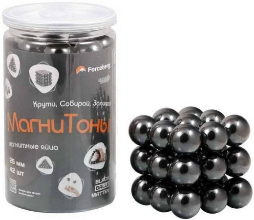 Мощный набор из 42 крупных магнитных шариков диаметром 25мм. Эти шарики еще называют “темная материя”. Возможно, из-за таинственного черно-блестящего цвета, а может быть из-за необычных свойств этих магнитов.