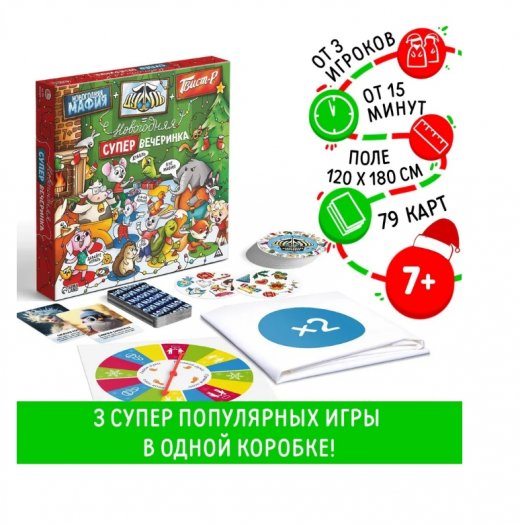 Ваши новогодние каникулы будут увлекательными и весёлыми, если провести их с популярными играми. Соберите друзей и родных за одним столом, выберите игру и наслаждайтесь атмосферой праздника. Пусть ваша новогодняя супервечеринка пройдёт круто! А ЧТО ЖДЁТ ВНУТРИ? «ТВИСТ-Р» - раскручивайте рулетку и смотрите, на какой сектор укажет стрелка. Именно туда нужно поставить руку или ногу. Осторожнее: некоторые цвета решили сыграть с вами в новогодние мини-игры! «ДУББЛЬ» - внутри вас ждёт 55 карт с уникальным набором картинок. На каждой паре карт есть одно общее изображение. Его-то вам и нужно найти! «МАФИЯ» - кто одержит победу на этот раз: злодеи, которые хотят испортить праздник, или лесные жители, которые верят в новогоднее чудо? Это вам и предстоит узнать!