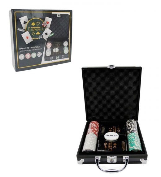 - Фабрика Покера: Набор из 100 фишек с номиналом для покера в кейсе цвет в ассорт