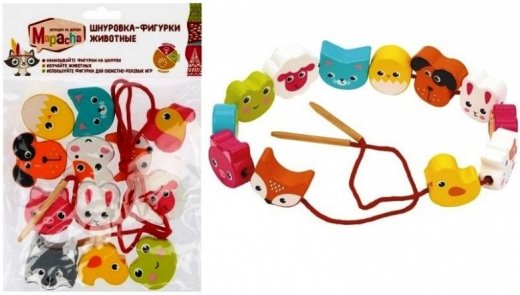 Цель игры: нанизать на шнурок все разноцветные бусинки, выполненные в виде милых и добрых зверюшек. Ребёнку будет очень интересно менять последовательность фигурок и разыгрывать с ними небольшие сценки! К обоим концам шнурка прикреплены удобные деревянные «иголки», с помощью которых можно легко продеть шнурок в отверстие бусины.