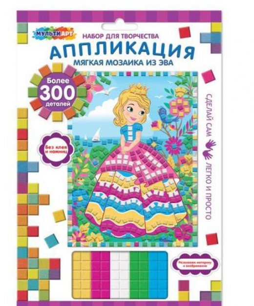 Набор для творчества - аппликация - мягкая мозаика из материала ЭВА «Принцесса» ТМ «Мульти Арт» - отличный подарок для ребёнка, который будет способствовать развитию его творческих способностей. Комплектация и особенности: - картонная основа для аппликации - более 300 деталей в наборе - без клея и ножниц - инструкция на обороте упаковки С помощью красочной основы и разноцветных деталей из мягкого материала маленький художник сможет самостоятельно создать яркую поделку-аппликацию, которую можно подарить родным, друзьям или использовать для украшения детской комнаты. Занятия с наборами для творчества ТМ «Мульти Арт» развивают: - внимание и усидчивость - творческое мышление - сенсорное и цветовое восприятие - моторику рук - воображение